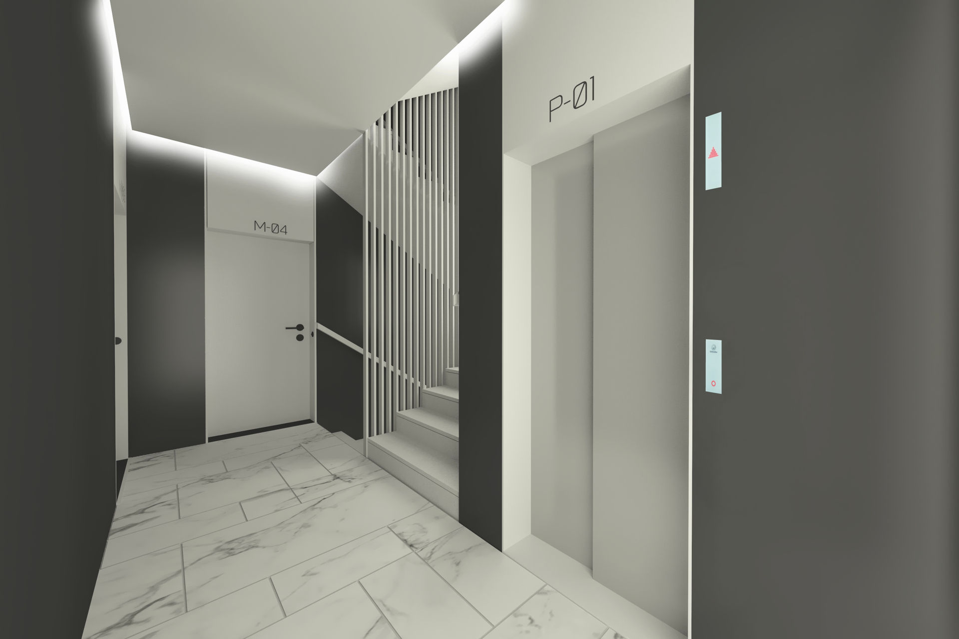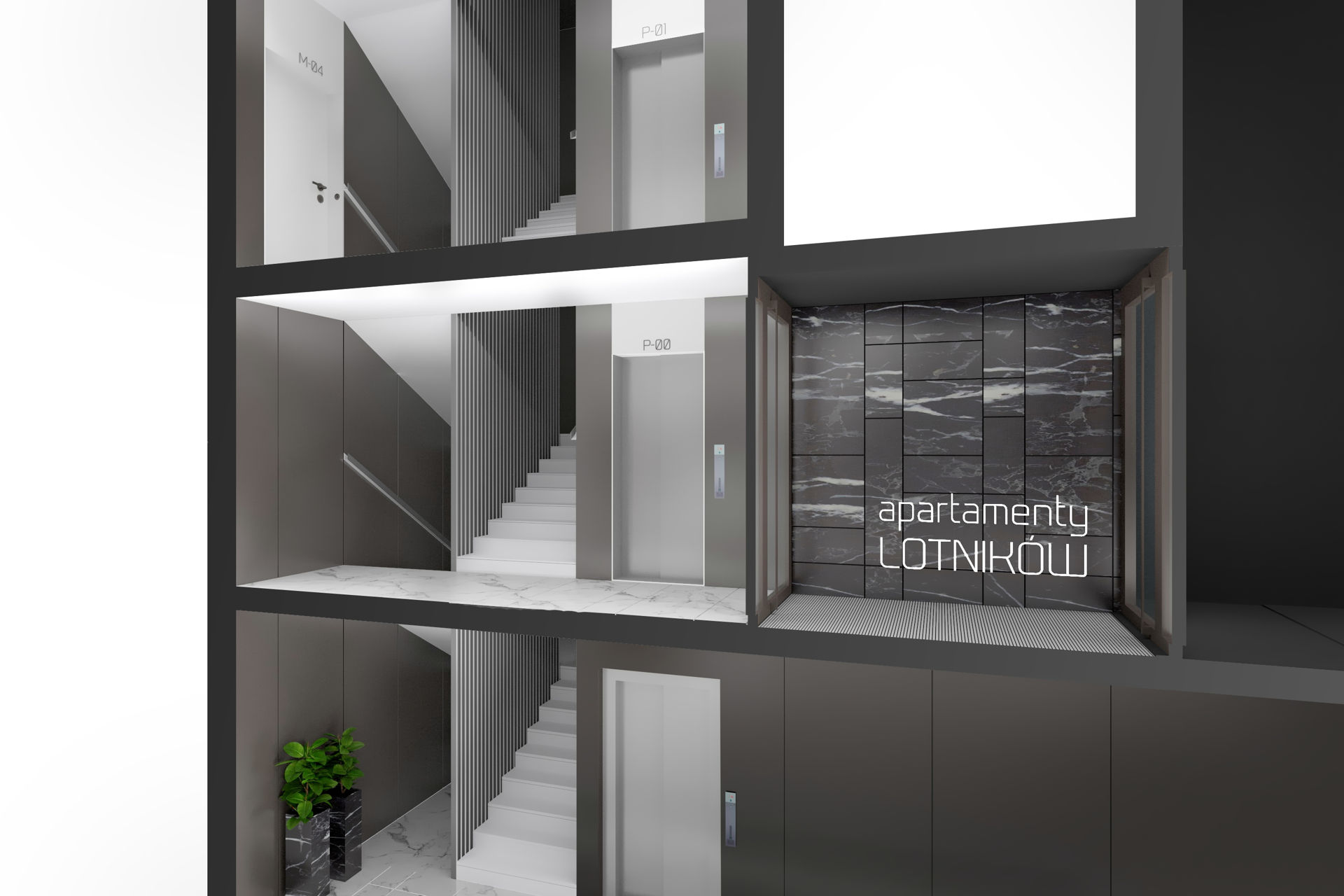 Dwa eleganckie, jednoklatkowe budynki wyposażone będą w windy od poziomu garażu. Na każdym poziomie znajdować się będą maksymalnie 4 apartamenty. Do mieszkań dostaniemy się przez recepcję/strefę wejścia, którą wykończymy w eleganckim stylu.