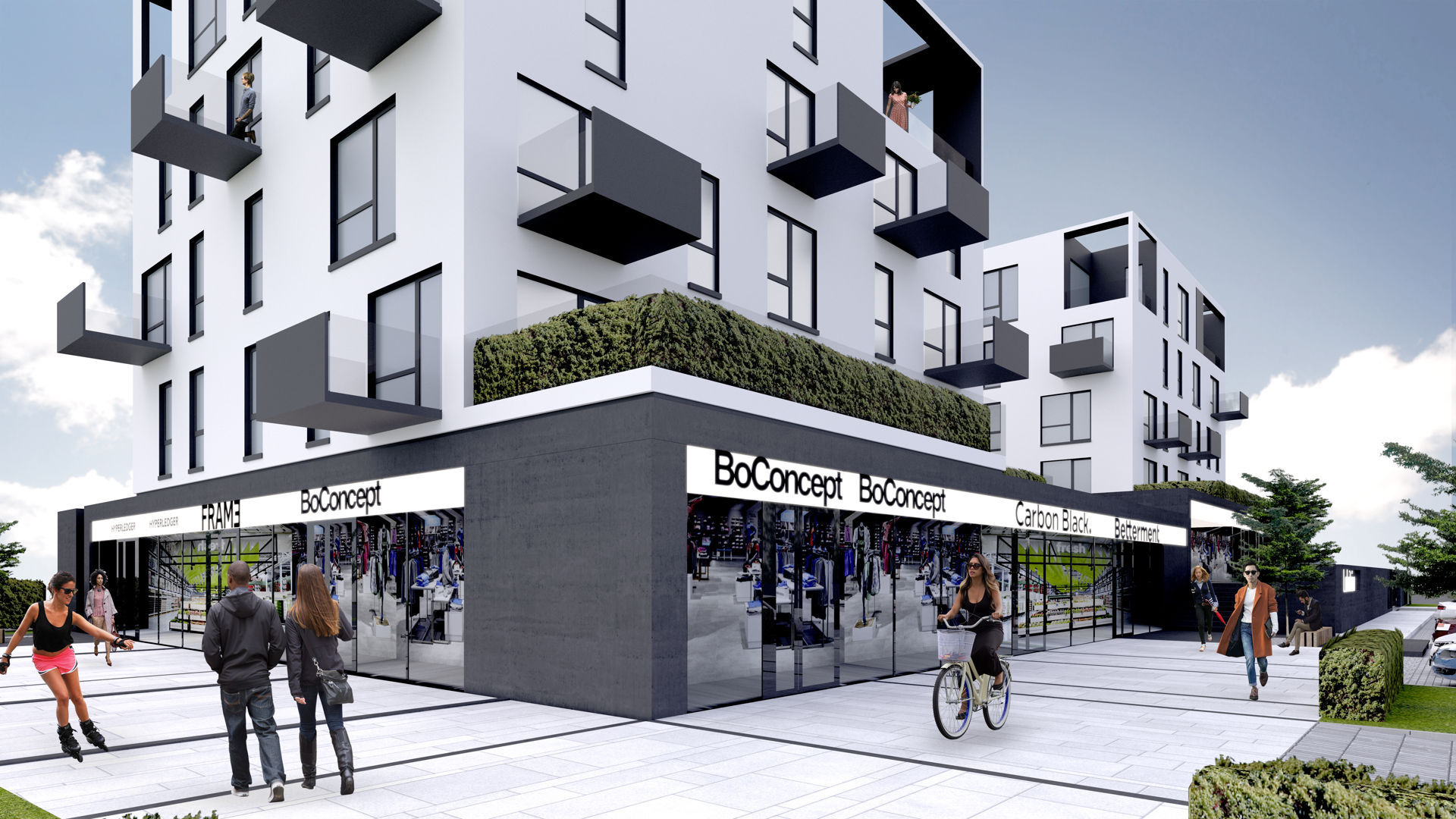 Wszystkie apartamenty posiadają balkony lub tarasy. Na wyższych kondygnacjach można nabyć ekskluzywne dwupoziomowe mieszkania z pięknymi słonecznymi tarasami.